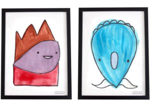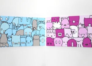 ROKIES - Small friends Artwork on paper The artwork Rokies is a minimalist masterpiece that explores the essence of human emotion and the simplicity of the human form. Through the use of minimalistic characters, strong colors, and bold black outlines, the artist has created a powerful visual